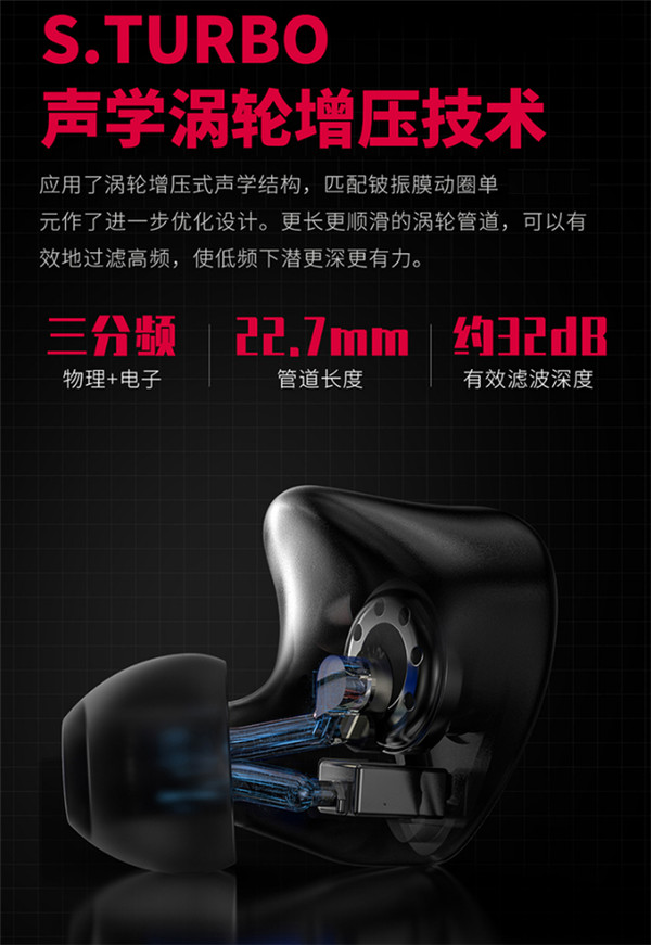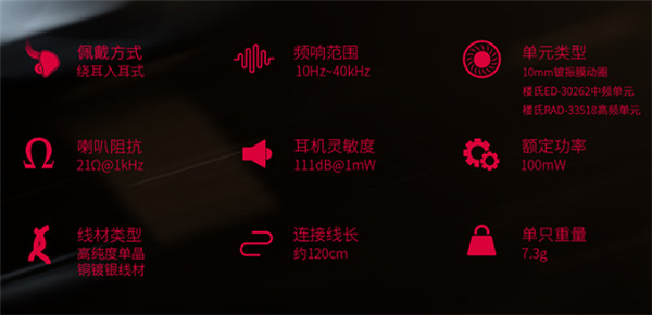 音频方面,耳机搭载 10mm 镀铍振膜动圈单元,利用铍振膜高刚性、轻薄的特点,呈现具有速度和力量感的低频。耳机中 / 高频搭载两颗楼氏动铁单元,其中高频采用 RAD-33518 型号,保证解析力和延展性;中高频采用 ED-30262,人声饱满甜美。