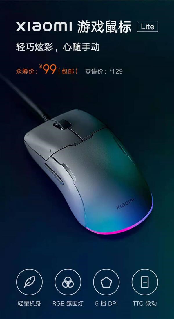 1 月 12 日消息,前些天小米推出了一款小米游戏鼠标 Lite,这款鼠标将于今天上午 10 点在小米商城开启众筹,零售价 129 元,众筹价 99 元。