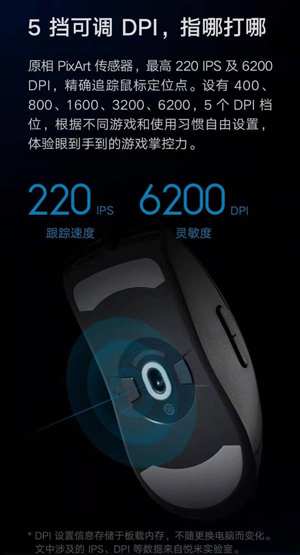 配置方面,这款鼠标搭载原相 PixArt 传感器,最高 220 1PS 及 6200DPI,精确追踪鼠标定位点。设有 400、800、1600、3200、6200,5 个 DPI 档位;采用 NXP 32 位 ARM 构架 MCU,快速处理传感器高效运作,1000Hz 数据回报率,达到 1ms 响应速度;主按键 TTC 防尘金微动,触发反馈迅速及时,8000 万次高强点击寿命。IP54 防护等级,5 重防护结构加固可靠性。