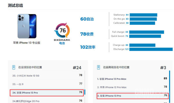 1月11日,DXOMARK公布了iPhone 13 Pro的电池得分:76分。DXOMARK表示,在本次进行对比的同类设备中,尽管苹果iPhone 13 Pro的电池容量最小,为3095mAh,但它仍然取得了不错的成绩。