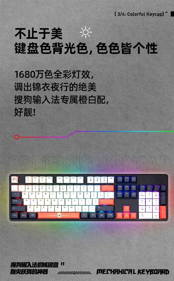 外观设计上,搜狗输入法机械键盘采用专属橙白配,色彩亮眼,同时具备1680万色全彩灯效。