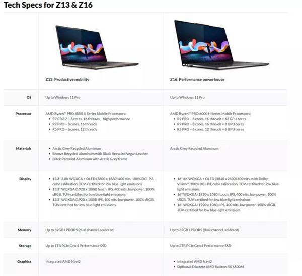 其他方面,这 2 款机型分别采用 13.3 英寸和 16 英寸的 WQXGA+OLED 屏,前者分辨率最高为 2800×1880,后者为 3840×2400,均为 400 尼特亮度、100% DCI-P3 色域、TV 低蓝光认证,Z16 还有杜比视界。