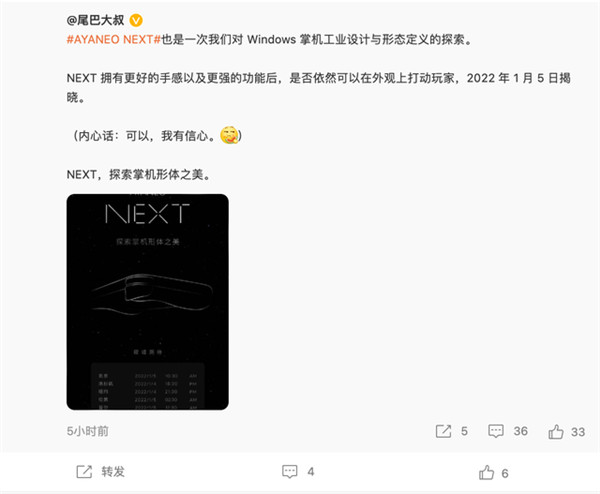 12 月 30 日消息,今天 @尾巴大叔预热了新款 AYANEO NEXT 掌机,表示这款掌机是他们对 Windows 掌机工业设计与形态定义的探索。