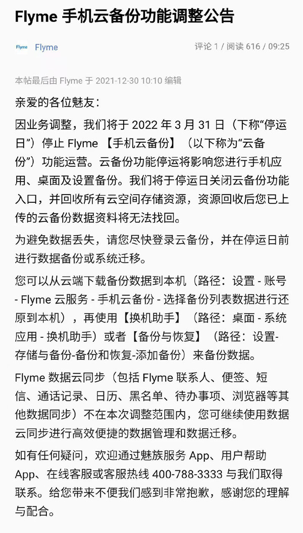 今天,魅族宣布因业务调整,将于2022年3月31日(下称“停运日”)停止Flyme【手机云备份】(以 下称为“云备份”)功能运营。