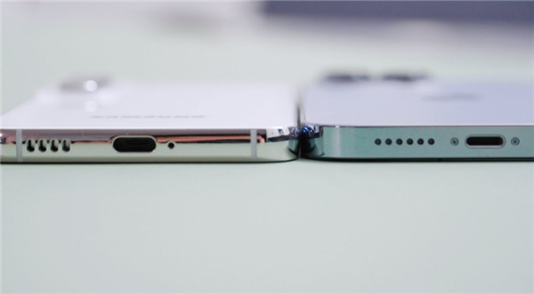 从机身侧边看,三星 Galaxy S22 采用了微弧的边框,而 iPhone 13 Pro Max 则是回归经典的直角边框,两者厚度上相差不大,似乎 Galaxy S22 更薄一些。