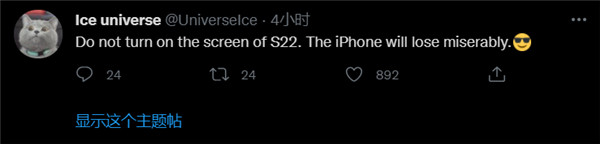 此外,i 冰宇宙表示:“不要点亮 S22 的屏幕,iPhone 将会惨败。”暗示三星 Galaxy S22 系列的屏幕将更加优秀。