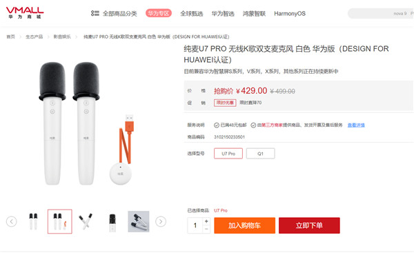 12 月 29 日消息,近期,华为商城上架纯麦 U7 PRO 无线 K 歌双支麦克风,支持 DESIGN FOR HUAWEI 认证(简称 DFH),售价 429 元,目前兼容华为智慧屏 S 系列,V 系列,X 系列,其他系列正在持续更新中。