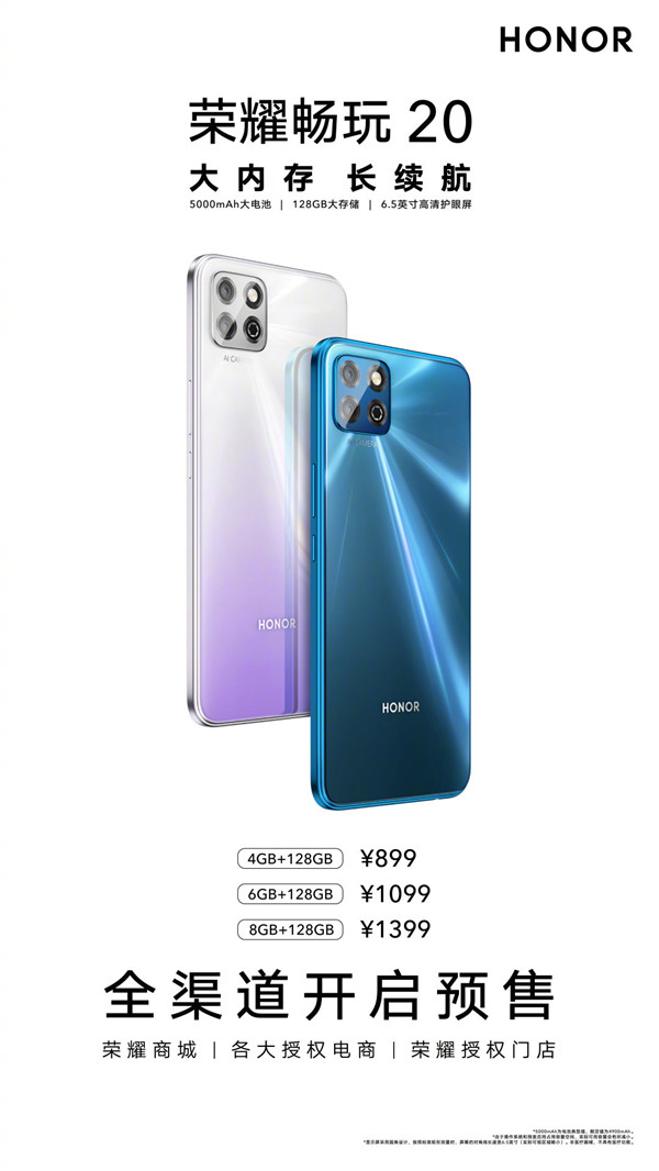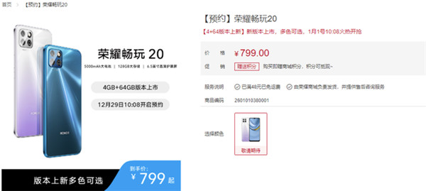 12 月 29 日消息,荣耀方面今日宣布,荣耀畅玩 20 全新的【4+64GB】新版本上市,提供多色可选,1 月 1 号 10:08 开售。