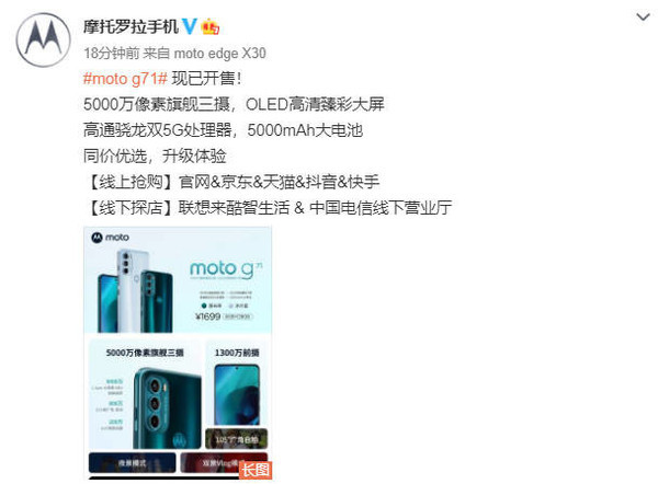 12月28日,moto另一款新机g71现在已经正式开售。该机后置5000万像素旗舰三摄像头,配备了一块OLED高清臻彩大屏,搭载高通骁龙双5G处理器,辅以5000mAh大容量电池,8GB+128GB版售价1699元。值得一提的是,虽然摩托罗拉官方称该机已在官网等其他渠道上市,但官网和京东平台都没有搜到这款新机,可能会在晚些时候上架。