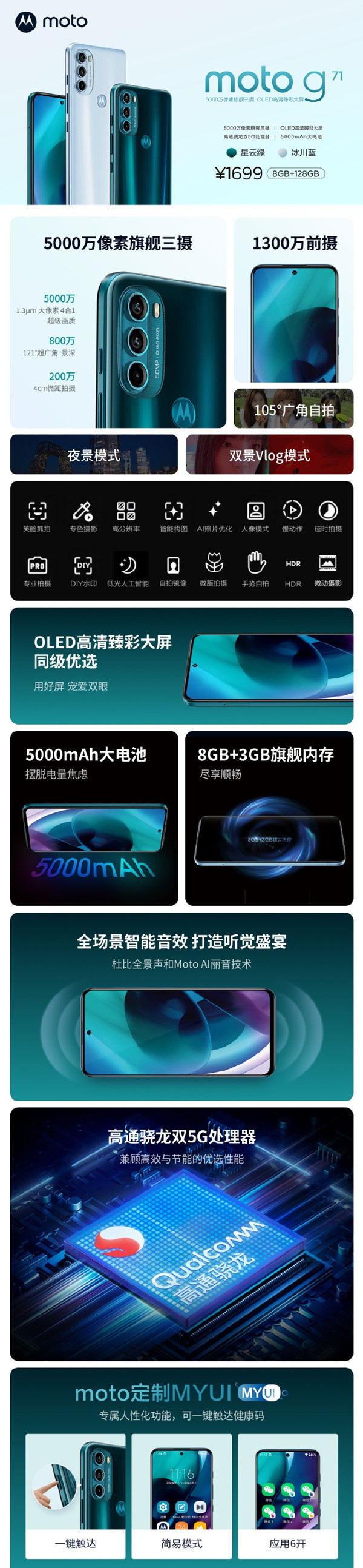 其他方面,moto g71拥有5000mAh大容量电池,相信能够满足日常一天使用需求;采用8GB运存,似乎还可以扩展3GB,最终带来11GB的运存体验;支持杜比全景声和Moto AI丽音技术,可以带来沉浸的音效体验;搭载了高通双5G处理器,兼顾高效与节能。