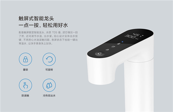 据介绍,这款净水器可实现 1 秒直出热水即滤即饮、每 1℃可调、触屏式智能龙头、双核内芯过滤、5 年长效滤芯、全时无陈水、3:1 纯废水比,一级水效,不费水,更环保。