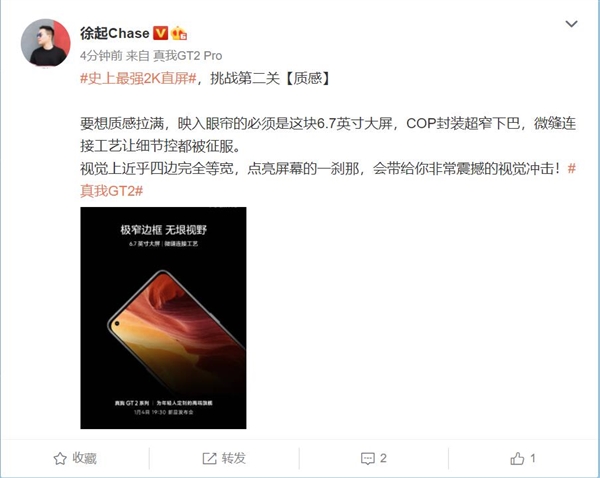 徐起表示,realme GT2 Pro采用了COP封装工艺,实现了超窄下巴,视觉上近乎四边完全等宽,点亮屏幕的一刹那,会带给你非常震撼的视觉冲击。