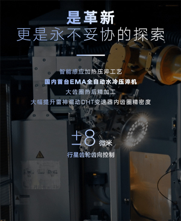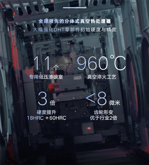 雷神智擎 HiX 混动系统在吉利雷神动力智能微米工厂制造,工厂具有全球领先的分体式真空热处理器,能够大幅强化 DHT 零部件初始硬度和精度,硬度可达 60HRC,真空淬火温度达到 960℃,还具有 11 个专用低压渗碳室。金属零件经过热处理后,齿轮形变小于 8 微米,优于行业平均值 2 倍。