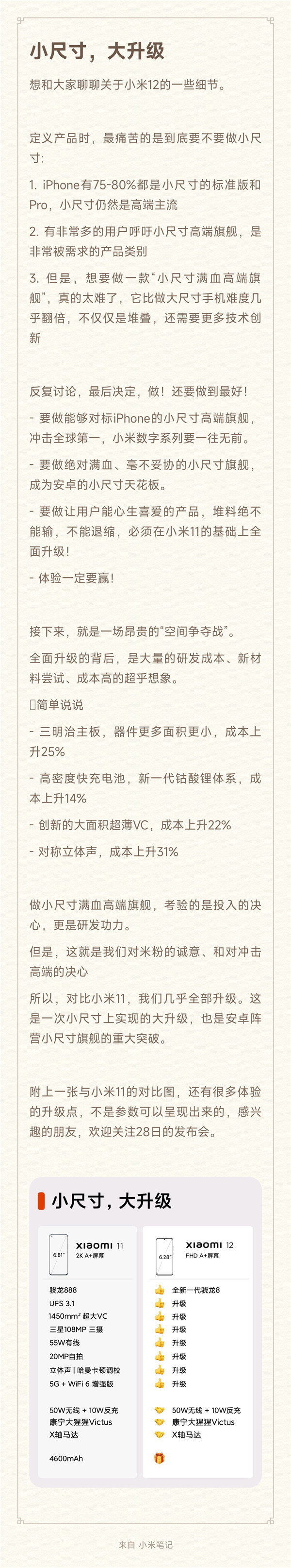 小米表示,做一款小屏手机有很多限制和困难,但经过“反复讨论”,最后决定还是要做“小屏满血高端旗舰”,“做!还要做到最好”“要做能够对标 iPhone 的小尺寸高端旗舰,冲击全球第一,小米数字系列要一往无前”“必须在小米 11 的基础上全面升级”“体验一定要赢”。