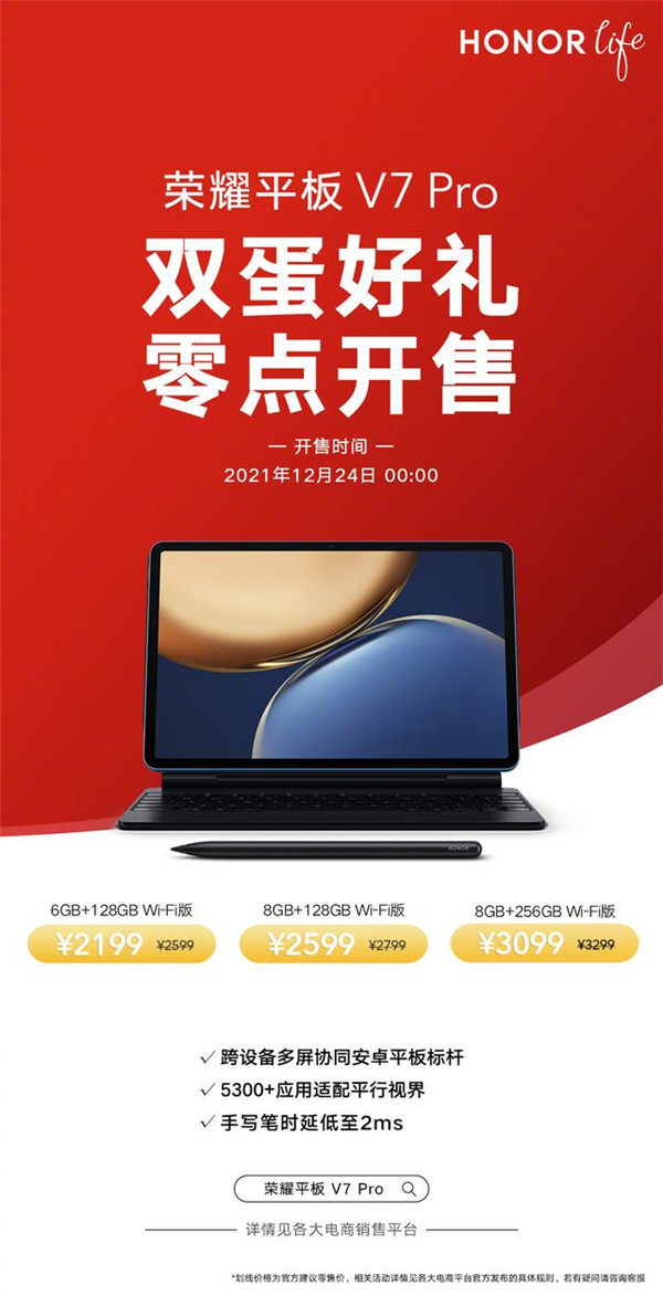 12 月 23 日消息,荣耀平板 V7 Pro Wi-Fi 版本目前正在预售中,将于 12 月 24 日零点再次开售。该系列平板屏幕尺寸为 11 英寸,采用 IPS 液晶屏,分辨率 2560×1600,刷新率 120Hz。本次开售的产品包含三款 WiFi 版本,价格相比首发价均有优惠。