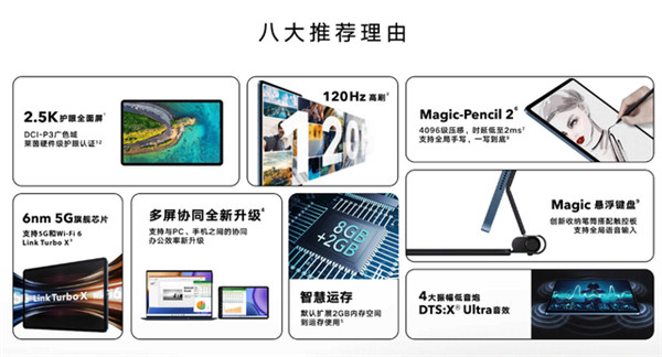 荣耀平板 V7 Pro 配备四颗扬声器,支持 DTS:X Ultra 音效,支持选配压感手写笔。产品装有 MagicUI 5.0 系统,支持多屏协同 / 全局手写 / 智慧分屏等功能。