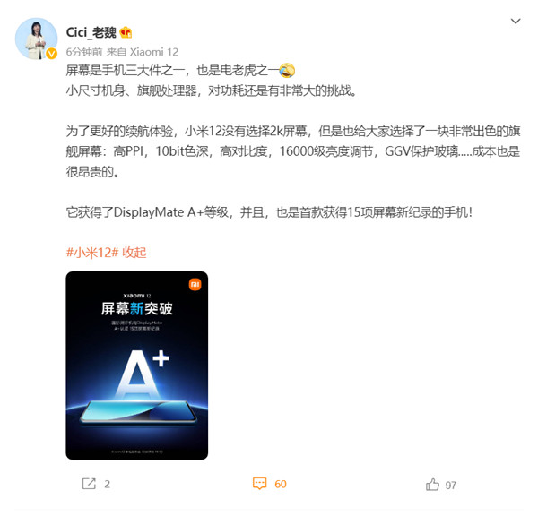小米 12 系列的产品经理“老魏”表示,为了更好的续航,小米 12 没有选择 2K 屏幕,但这块屏幕依旧具有 10 bit 色深、高对比度等,“成本也是很昂贵的”。