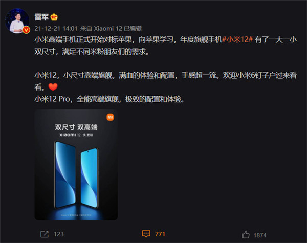 小米创始人雷军又喊话“小米 6 钉子户”,表示小米 12 手感超一流。
