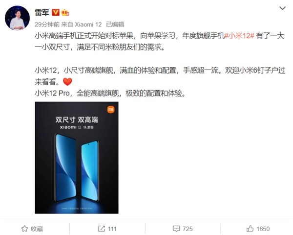 雷军表示, 小米高端手机正式开始对标苹果,向苹果学习,年度旗舰手机小米12 有了一大一小双尺寸,满足不同米粉朋友们的需求。
