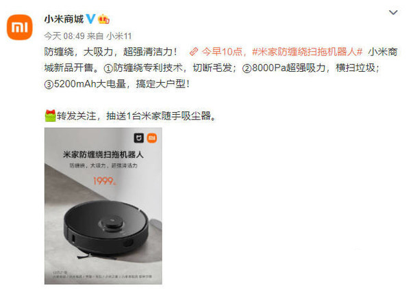 米家防缠绕扫拖机器人开售