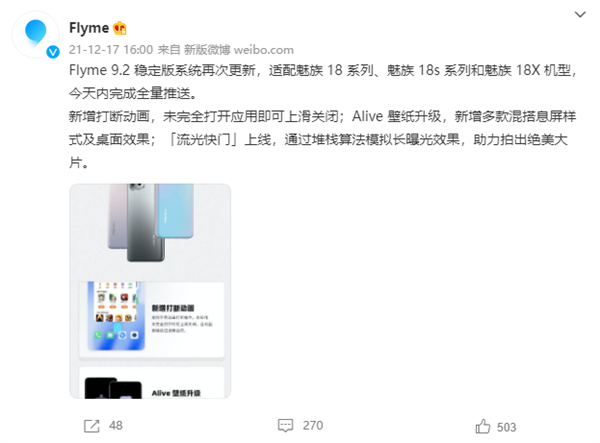 12月17日,Flyme官方微博宣布,Flyme9.2稳定版迎来新一波的更新,此次更新适配了魅族18系列、魅族18s系列以及魅族18X,并宣布将在今天完成全量推送。