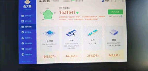 如上图所示,i7-12700H 在鲁大师中跑分 645507,RTX 3070 Ti 显卡跑分 449494。