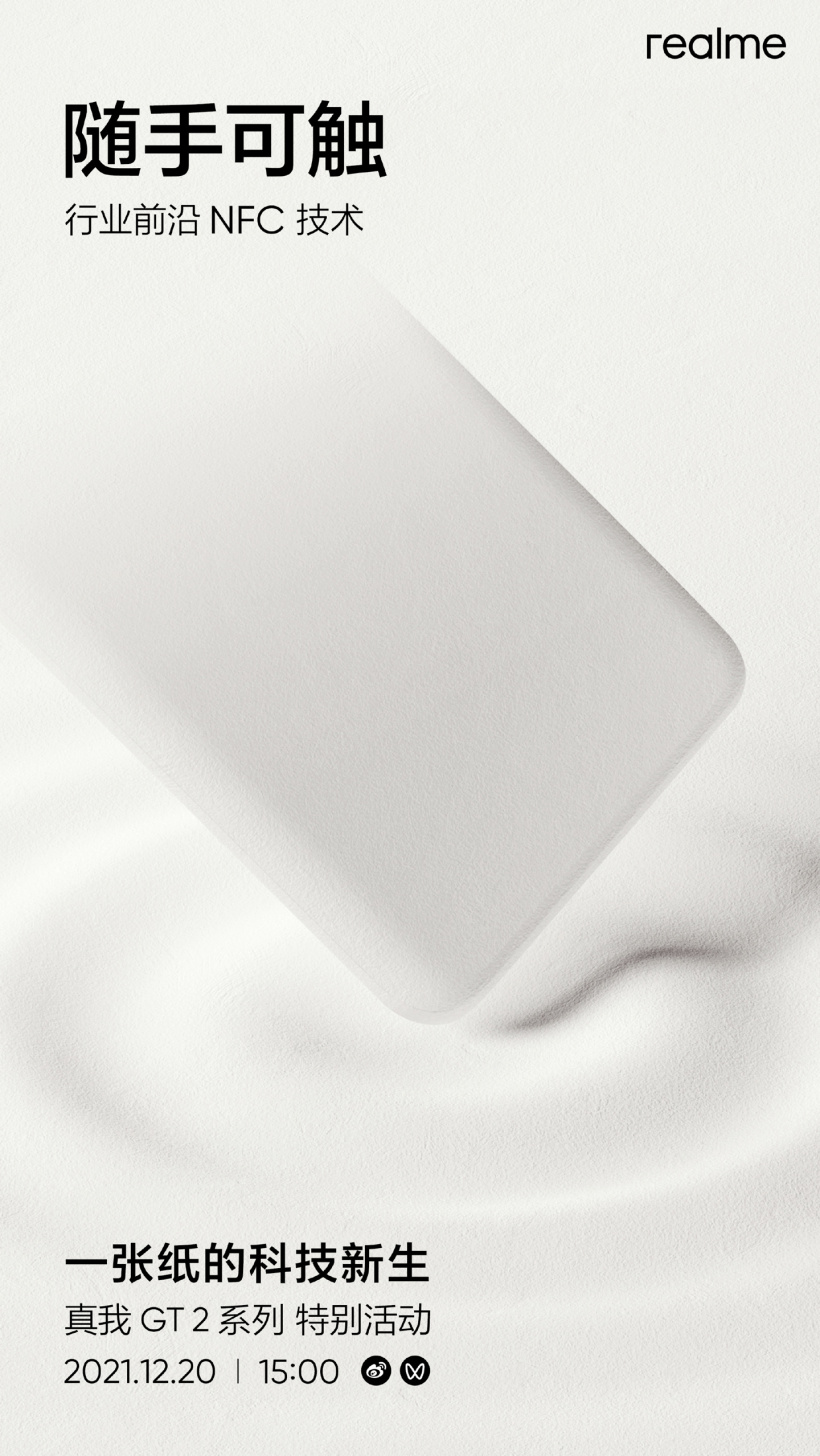 12 月 18 日消息,realme 真我 GT2 系列将于 12 月 20 日发布。今日官方表示,该系列手机将搭载行业前沿 NFC 技术,“智能便捷,随手可触。”