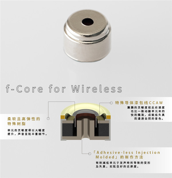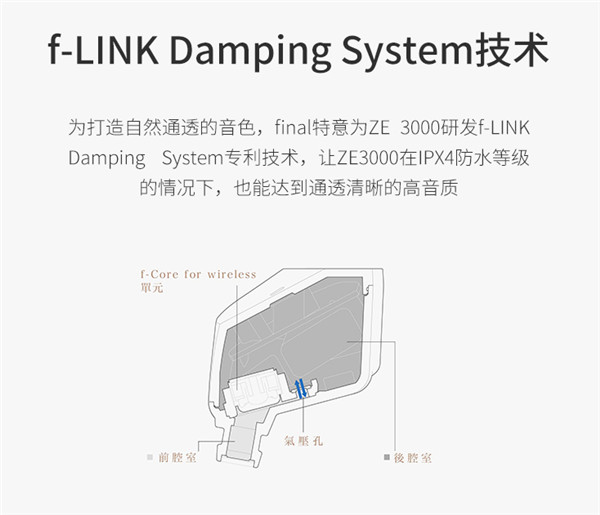 耳机搭载 final 自研的 6mm 微动圈单元,十分接近导管,保证声音解析。耳机拥有 f-LINK 阻尼系统专利,具有特别设计的前后腔体和泄压孔,打造自然通透的中高频。