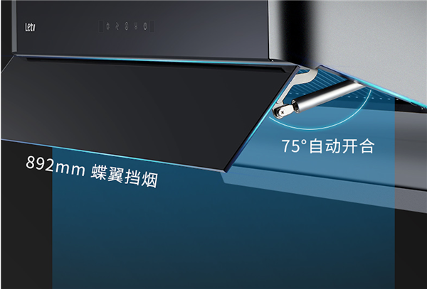 乐视油烟机K12隔烟屏加宽至892mm,开合窗宽度达到75°,隔烟屏自动开合,强效拢烟零跑烟,让油烟不冲脸,更快排净。