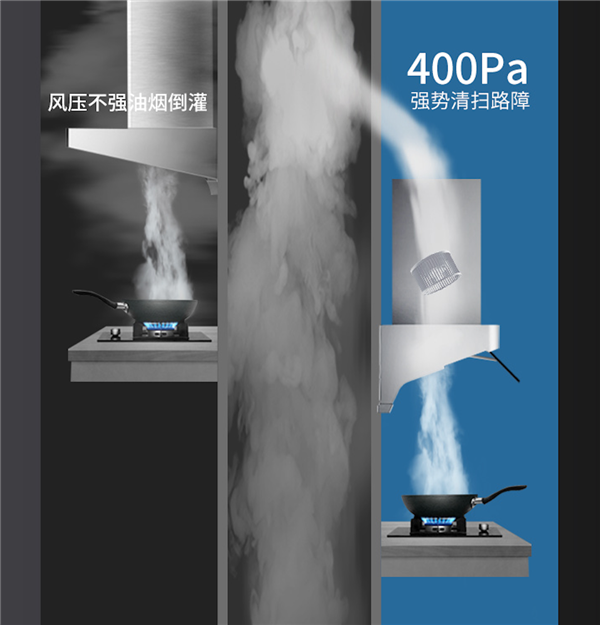 风压不足,不能及时带走油烟,极易出现油烟倒灌,屋里油烟味刺鼻又呛人。乐视油烟机K12具有400Pa强劲风压,确保做饭再多油烟也能顺畅排净,不再倒灌。