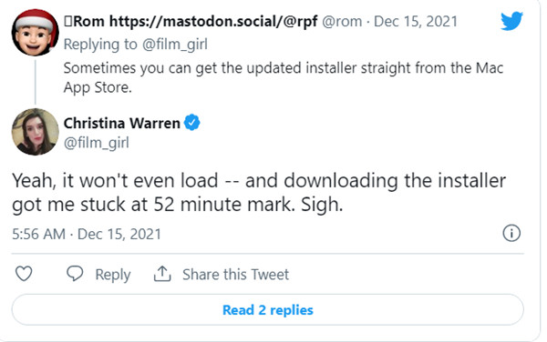 不幸的是,到目前为止,这个问题似乎还没有一个简单的解决方法。媒体 9to5 Mac 编辑 Bradley Chambers 试图从 App Store 下载 macOS Monterey 的完整安装程序,但下载到 52% 时就卡住了。Christina Warren 在 Twitter 上提到,她也有同样的问题。
