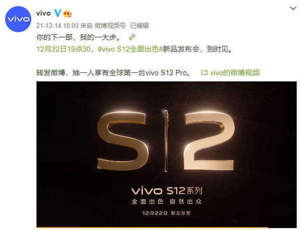 “你的下一部,我的一大步。”12月14日,vivo官宣,vivo S12系列全面出色新品发布会将于12月22日19:30正式举行。从官方透露的信息来看,除了vivo S12,届时vivo S12 Pro也将正式登场。