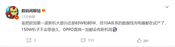 12 月 4 日消息,微博博主 @数码闲聊站 今日表示,OPPO 欧加系很多新机还是 65W 和 80W 快充,但是能够承载 10A 电流的数据线、充电器等都在试产了,支持 150W 快充的机型不会等很久。