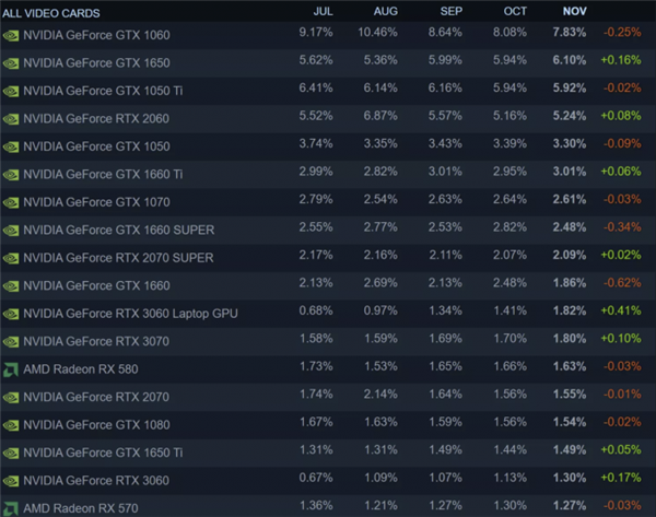 安培系列GPU在11月Steam调查中表现出色。所有NVIDIA最新显卡用户份额都在增加。
