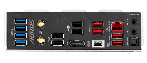 在后面板 IO 接口的支持上,技嘉提供了 2.5Gbps 千兆网口以及 Wi-Fi 6 的支持,其他接口上,技嘉小雕 PRO Z690 主板拥有 4 个 USB 2.0 接口,4 个 USB 3.2 Gen1 接口,4 个 USB 3.2 Gen2 接口,1 个 USB 3.2 Gen2x2 Type-C 接口,1 个 DP 1.4 接口,1 组音频接口。