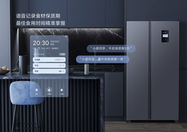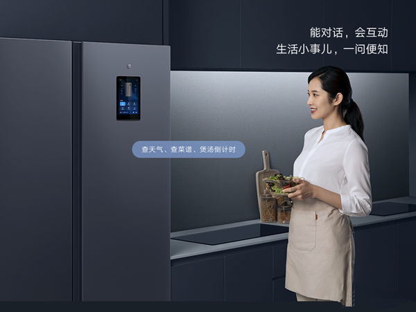 这款冰箱搭载了一块8英寸的液晶触控屏,内置了小爱同学,通过小爱同学,能实现各种智能互动功能,比如查天气、菜谱等信息,或者是烹饪时候的倒计时等。值得一提的是,它还支持冰箱里存储的食物倒计时和留言板功能,更具实用性。