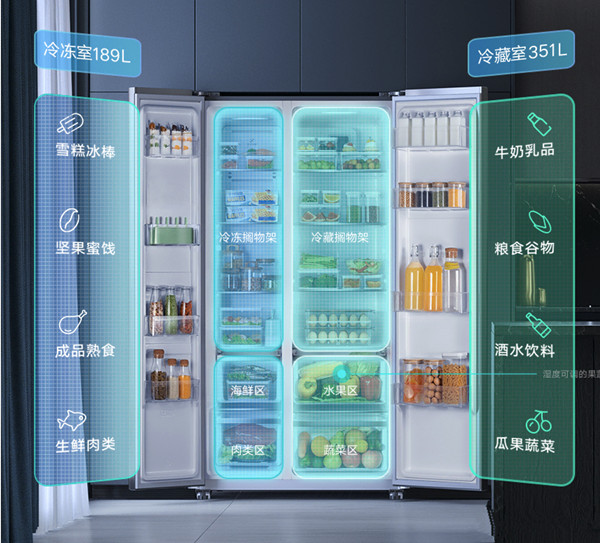 这款冰箱总容积为540L,冷藏室为351L,冰冻室为189L,能划分为20格的分区存储,不同类型的食材可区分保存。冰箱采用360°环抱立体送风,风冷无霜无需手动除霜,内置四枚温度传感器并支持4种制冷模式,可根据不同食材的保存需求匹配温度。