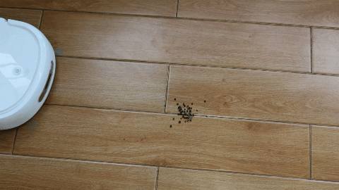 猫粮颗粒相对较大,比较难吸附,一开始我估摸着需要用到强劲模式清扫,但其实常规扫模式就能够将猫粮轻松带走,而且也是一次性就清洁干净了。