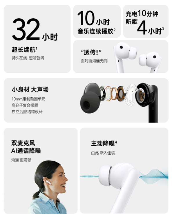 音质方面,耳机双麦克风支持“波束成形技术”,搭配 AI 神经网络算法,有效减少风噪,并智能拾取人声,让通话更清晰。产品还支持通透模式,便于聆听周围声音,无需摘下耳机。