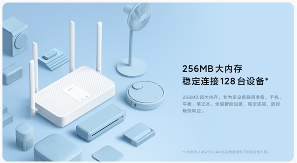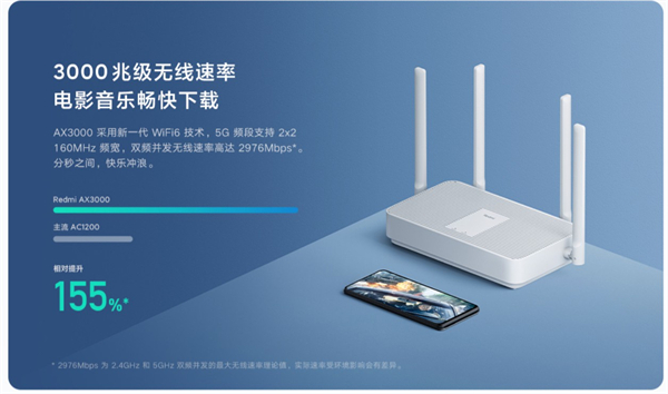 CPU是高通IPQ5000,双核1.0GHz A53的CPU +单核1.0GHz的NPU,256MB内存+128MB ROM。无线部分,是574Mbps 2x2的2.4G Wi-Fi,加上2402Mbps 2x2 160MHz的5G Wi-Fi,合计2976Mbps(毕竟是叫AX3000)。Redmi路由器AX3000售价269元,首发249元。