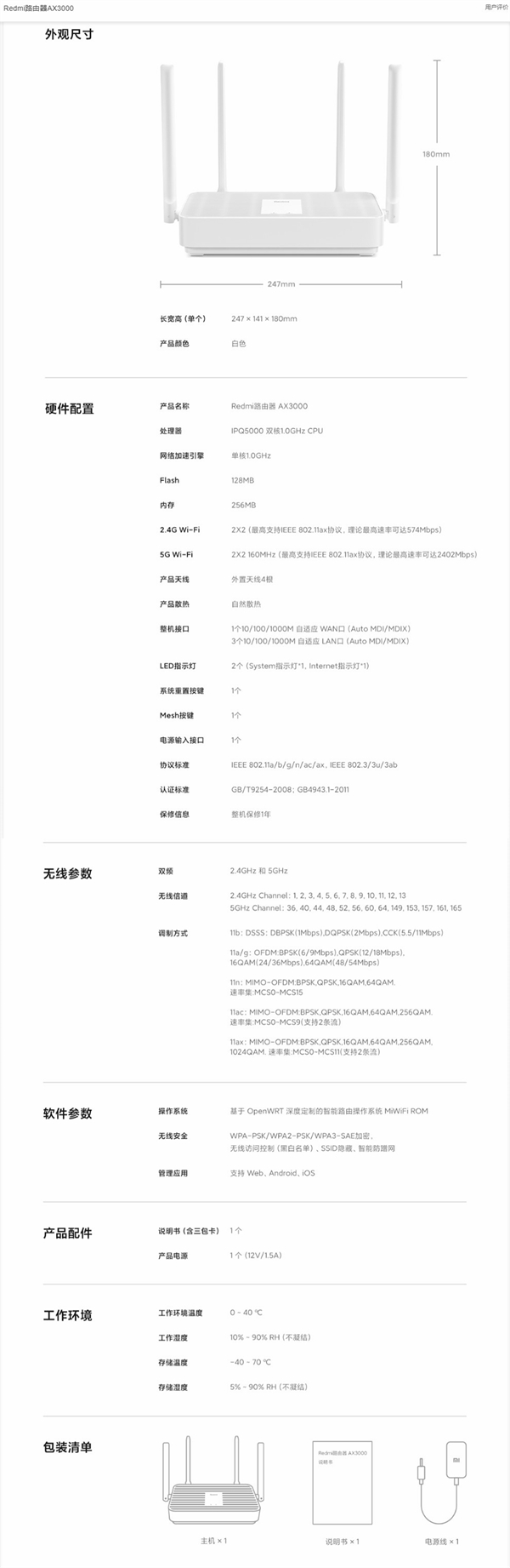 Redmi路由器AX3000的详细规格:
