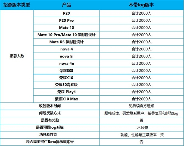根据博主@菊厂影业Fans 最新消息,华为目前已经开始了第四批内测招募计划,覆盖了荣耀旗下的14款老设备,具体包括:华为P20、华为Mate 10、华为P20 Pro、华为Mate 10 Pro、华为nova 5i 华为Mate 10保时捷设计、华为nova 4、华为Mate RS保时捷设计、华为nova 4e、荣耀X10、荣耀30S、荣耀X10Max、荣耀30青春版、荣耀Play4。