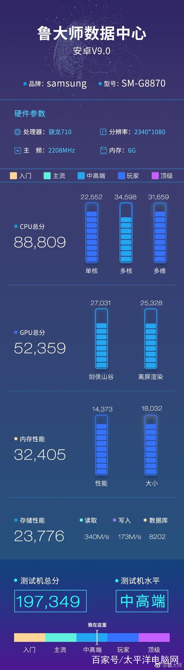 从鲁大师数据中心展示数据来看,三星A8S搭载高通骁龙710处理器,配备6GB内存+128GB存储,屏幕分辨率为2340×1080,综合跑分成绩为197349,其中CPU总分为88809,GPU总分为52359,内存性能为32405,存储性能为23776。