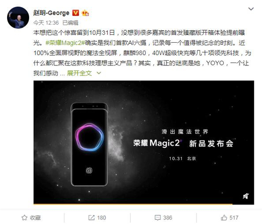 10月23日消息,华为荣耀业务部总裁刚刚在微博放出了荣耀Magic 2的宣传视频,曝光了新机的许多特性。