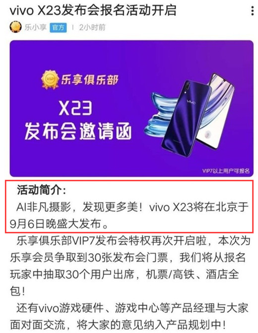 vivoX23发布时间确定:9月6号北京见日前,vivoX23发布会报名活动在vivo乐享俱乐部已经开启。从活动详情看,vivoX23的发布会地点位于北京,具体地点不详,时间则是9月6号晚上。看来,下周手机圈会很热闹。