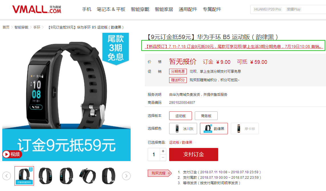 开售时间然后商城上也有广告打出“7月19日10:08首销”的标语,由此可以推断,华为B5手环将在1月19日上午10点08分正式开售,没有预定的用户届时可以到华为商城进行购买,其他各大销售平台也会相继的上架商品,喜欢的朋友也可以耐心等待。