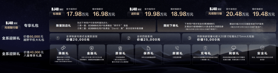 面对消费者,北京越野始终充满诚意。BJ40增程元境智行带来了两大全系迎新礼,BJ40增程标准版、进阶版、元境智行三个版型均能享受。
