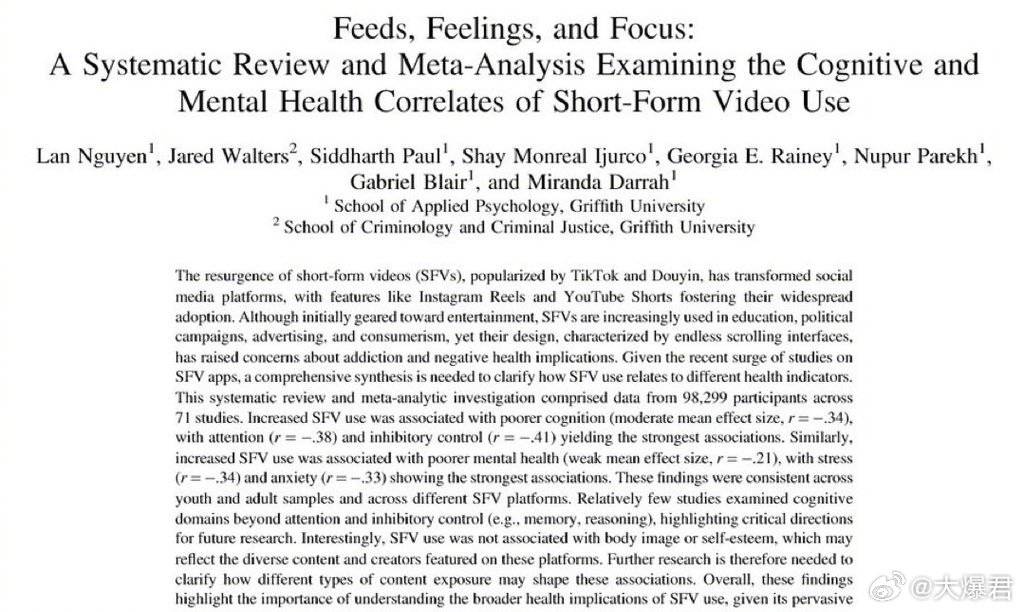 短视频使用量的增加与心理健康状况不佳有关,其中压力和焦虑的关联最为显著。这些研究结果在青少年和成人的样本中均保持一致,并且在不同的社交视频平台中也均适用。