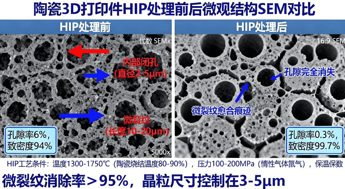 图1:陶瓷3D打印件HIP处理前后微观结构SEM对比