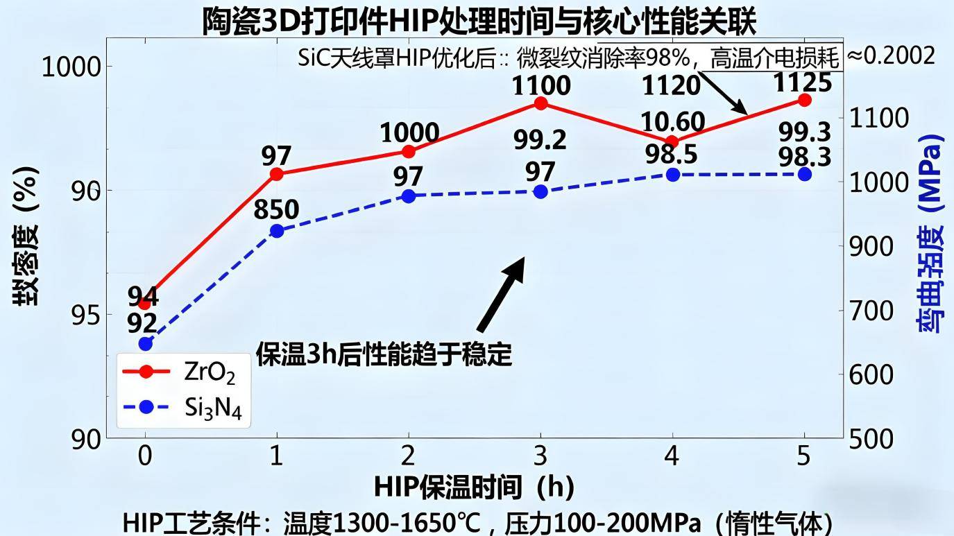 图2:陶瓷3D打印件HIP处理时间与核心性能参数
